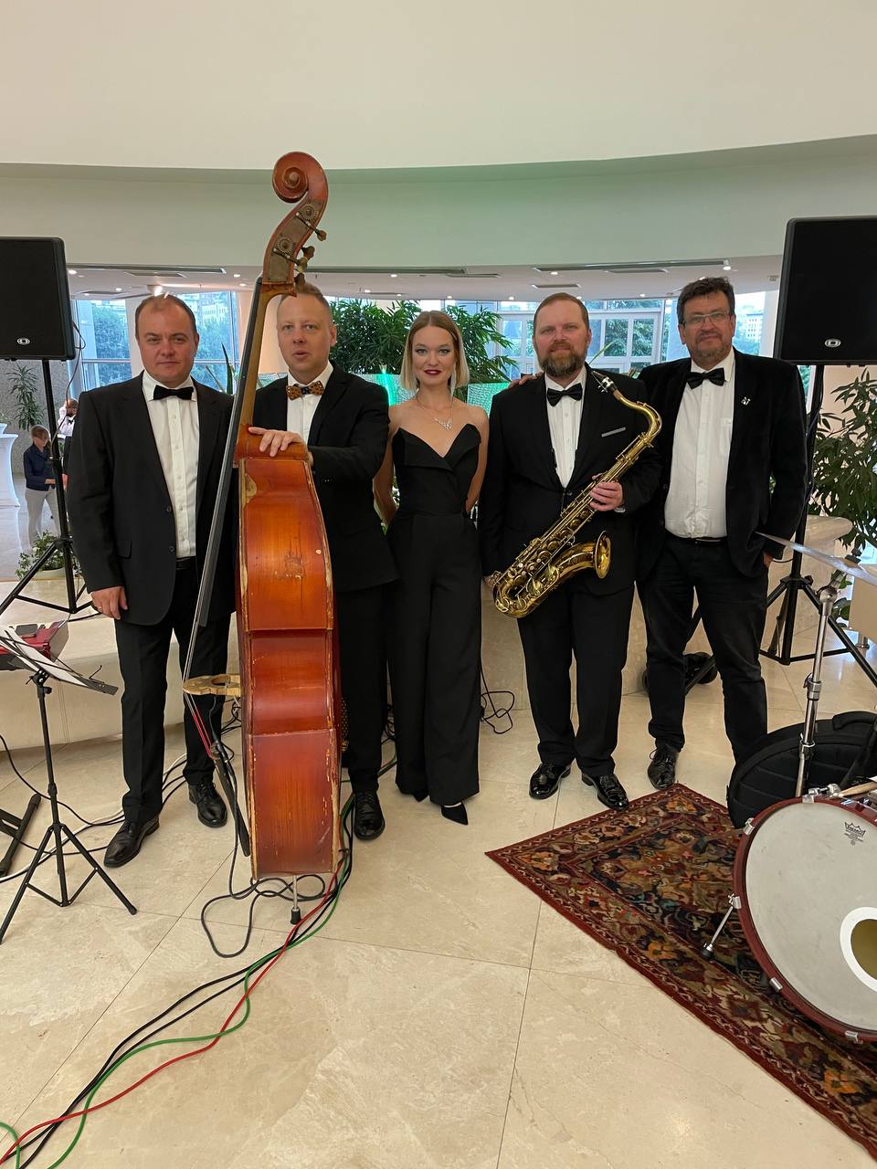 Мероприятие продолжалось на сцене, а в перерыве между частями джазовый коллектив снова порадовал гостей своим выступлением. Музыканты исполнили несколько известных композиций, которые поддержали атмосферу вечера. Гости оставались в приятном настроении, делились впечатлениями и наслаждались живым звучанием.